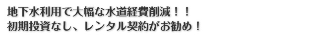 近年、水処理技術の飛躍的な向上により、地下水を利用する大型施設が増えています。 地下水開発計画から水処理プラント選定、行政申請手続きまでトータル的にご提案させて頂いています。 設備導入も買取、リース、レンタルなど、様々な方法が可能です。 水道経費削減なら弊社にお任せ下さい。